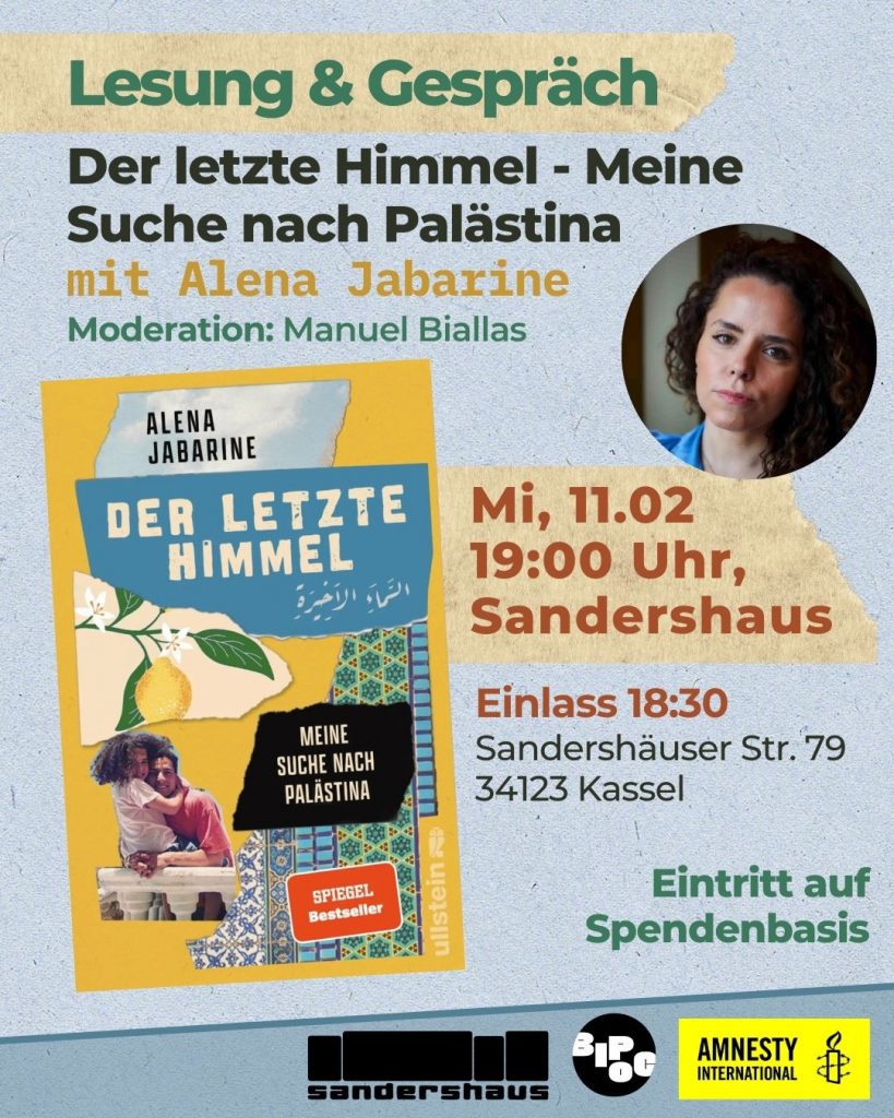 Alena Jabarine ist Deutsch-Palästinenserin aus Hamburg. Nach ihrem Politikstudium in Hamburg und Barcelona absolvierte sie ein journalistisches Volontariat beim NDR und arbeitet seitdem u.a. als freie Journalistin. Von 2020–2022 lebte sie in Ramallah, wo sie für eine deutsche politische Stiftung arbeitete, und hat über diese Jahre ihr erstes Buch geschrieben. „Der Letzte Himmel“ erschien im Mai im Ullstein-Verlag und stieg direkt auf die Spiegel-Bestsellerliste ein.